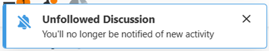 You can unfollow a topic you are following by selecting the bell icon at the top right of your screen. A confirmation message will be displayed stating that you have unfollowed the discussion.